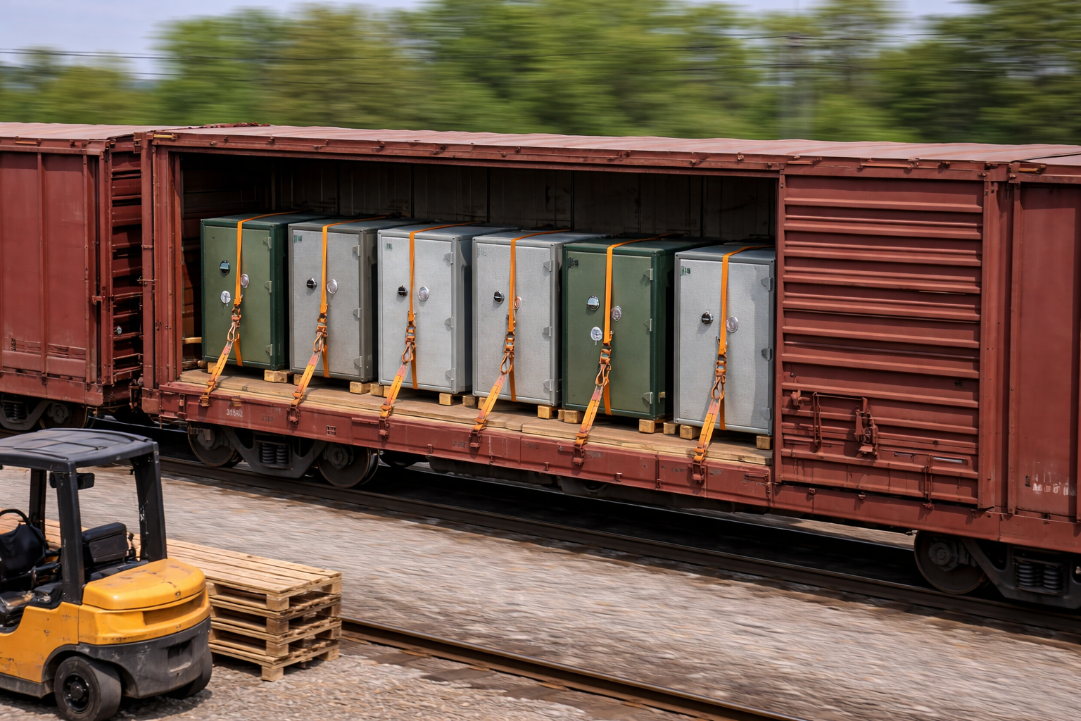 Việc cố định đúng kỹ thuật giúp két sắt duy trì vị trí ổn định trong suốt quá trình vận chuyển đường sắt.
